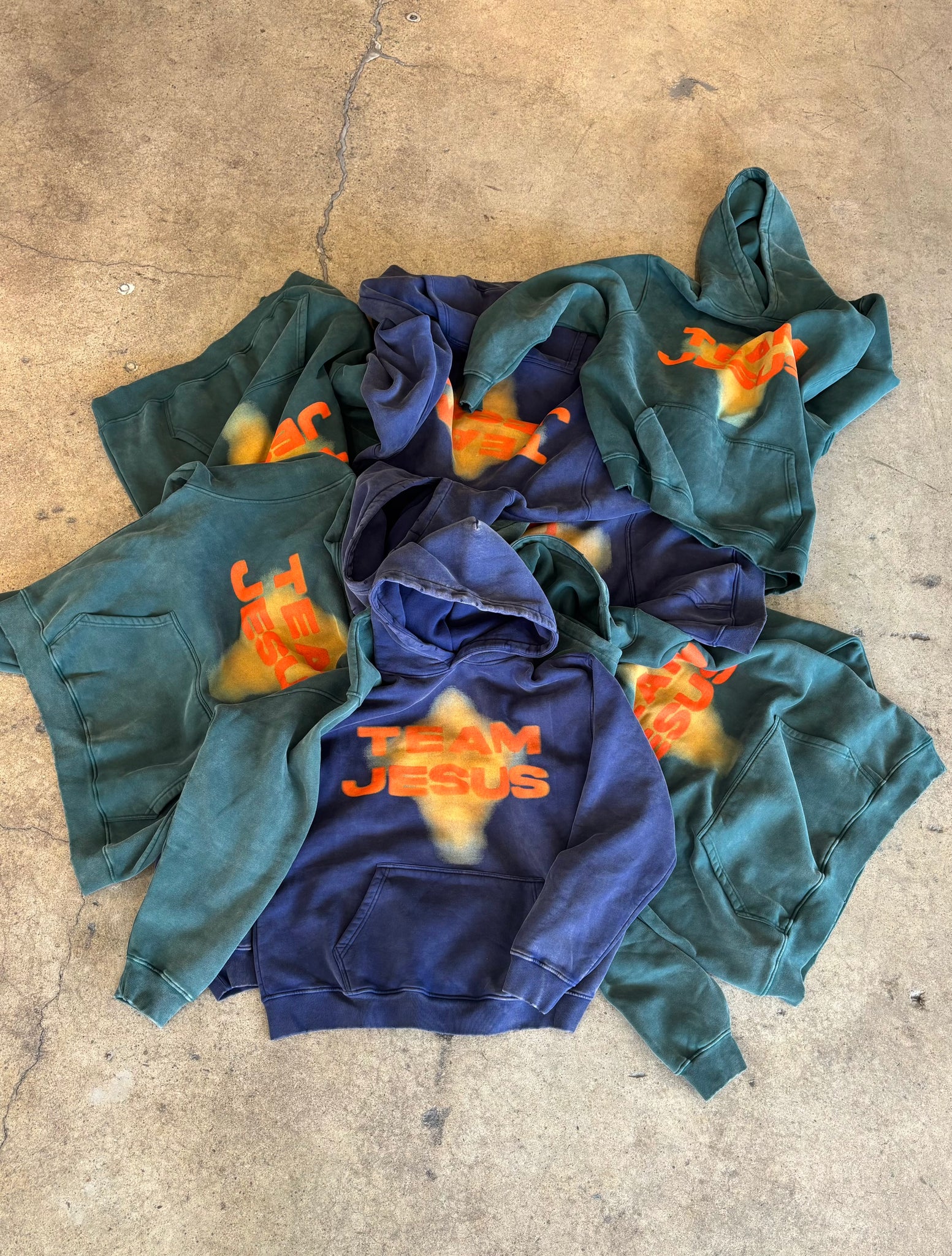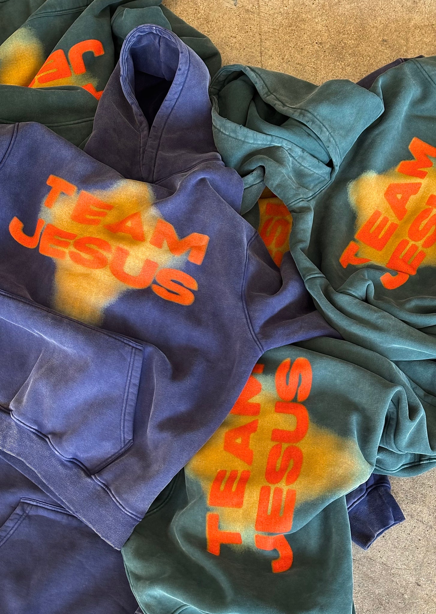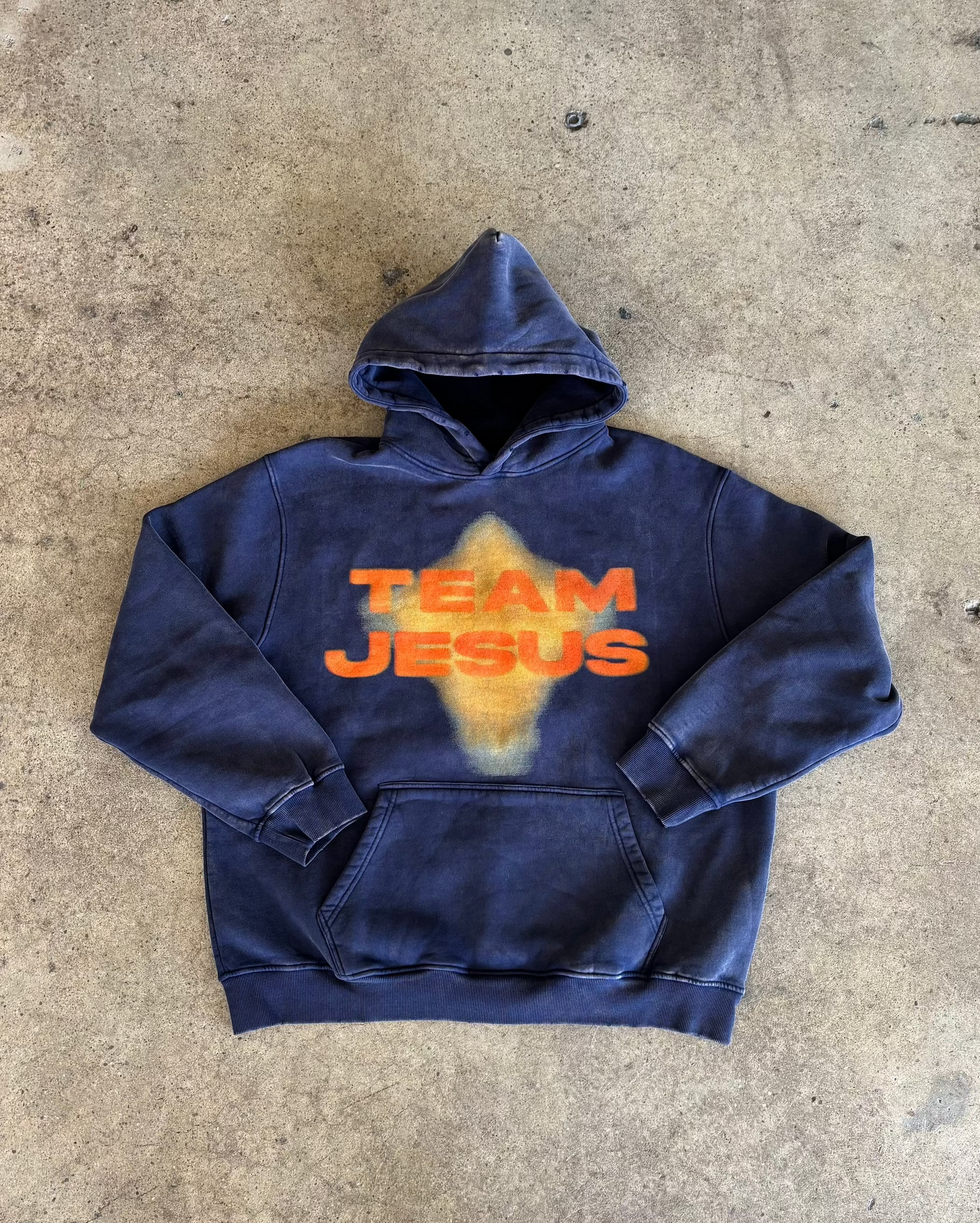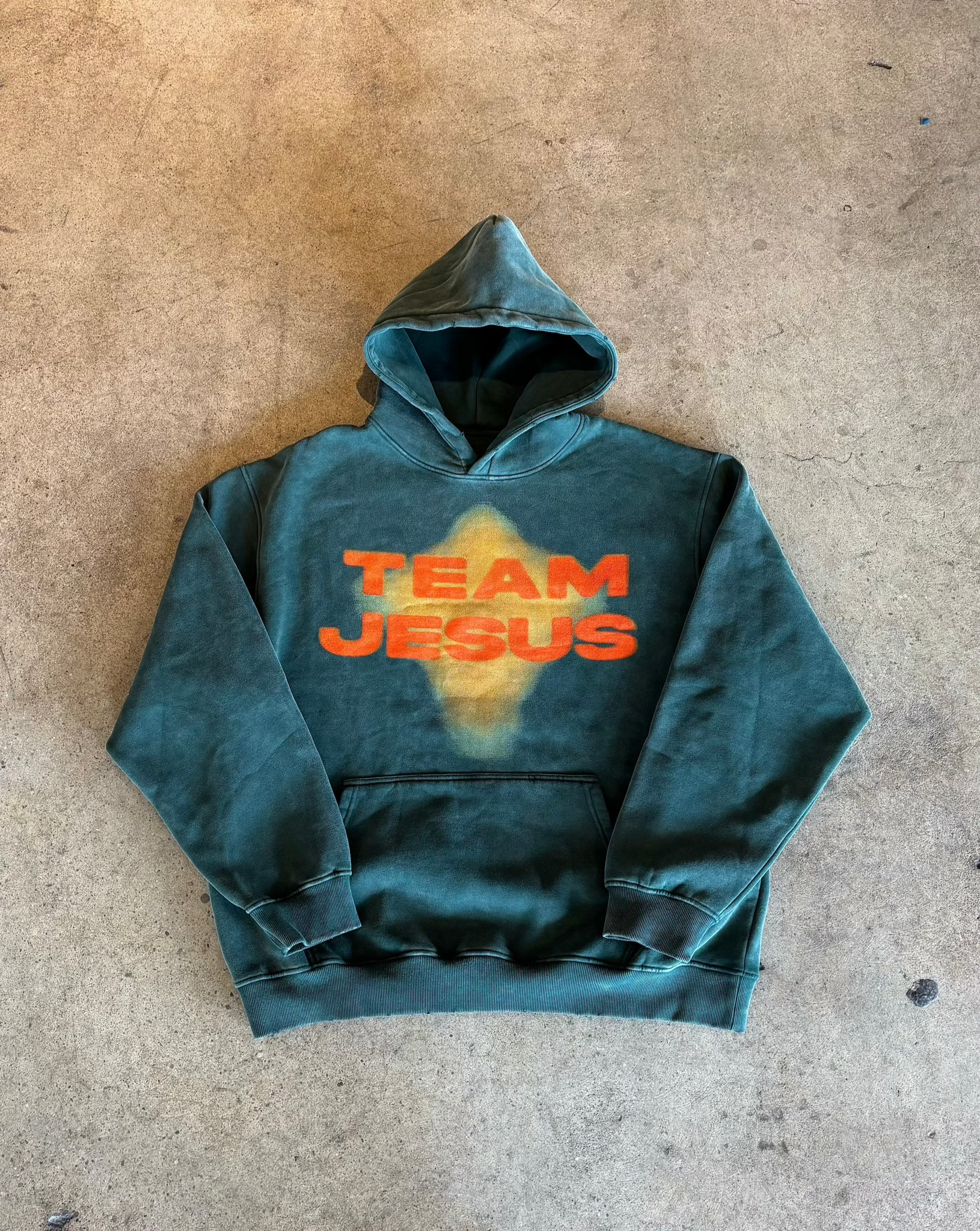 Gradient washed hoodie with figure of light and "Team Jesus" printing.