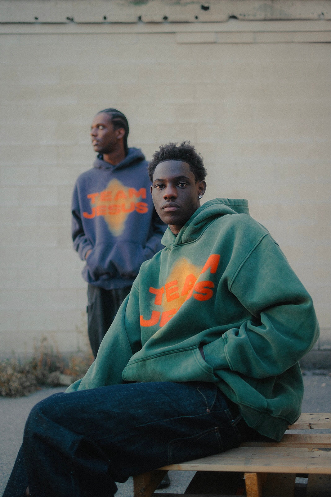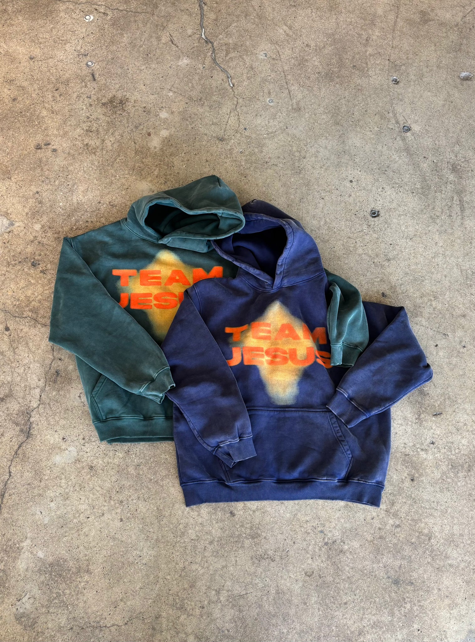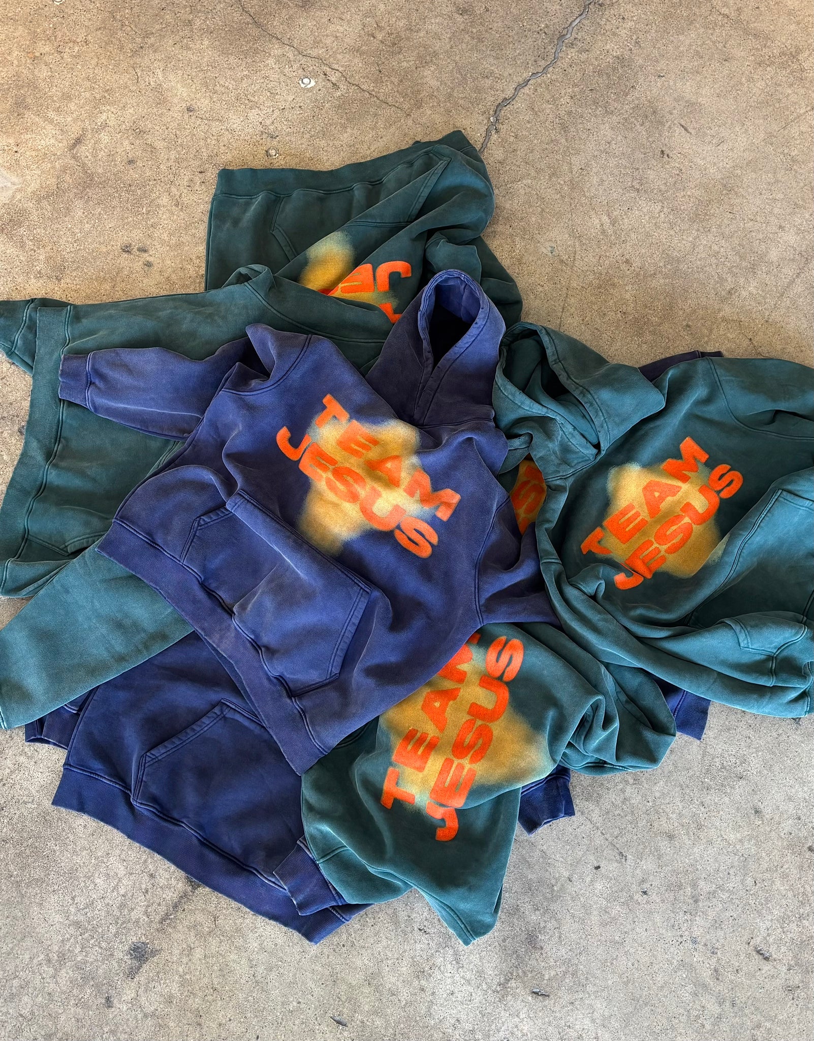 Gradient washed hoodie with figure of light and "Team Jesus" printing.