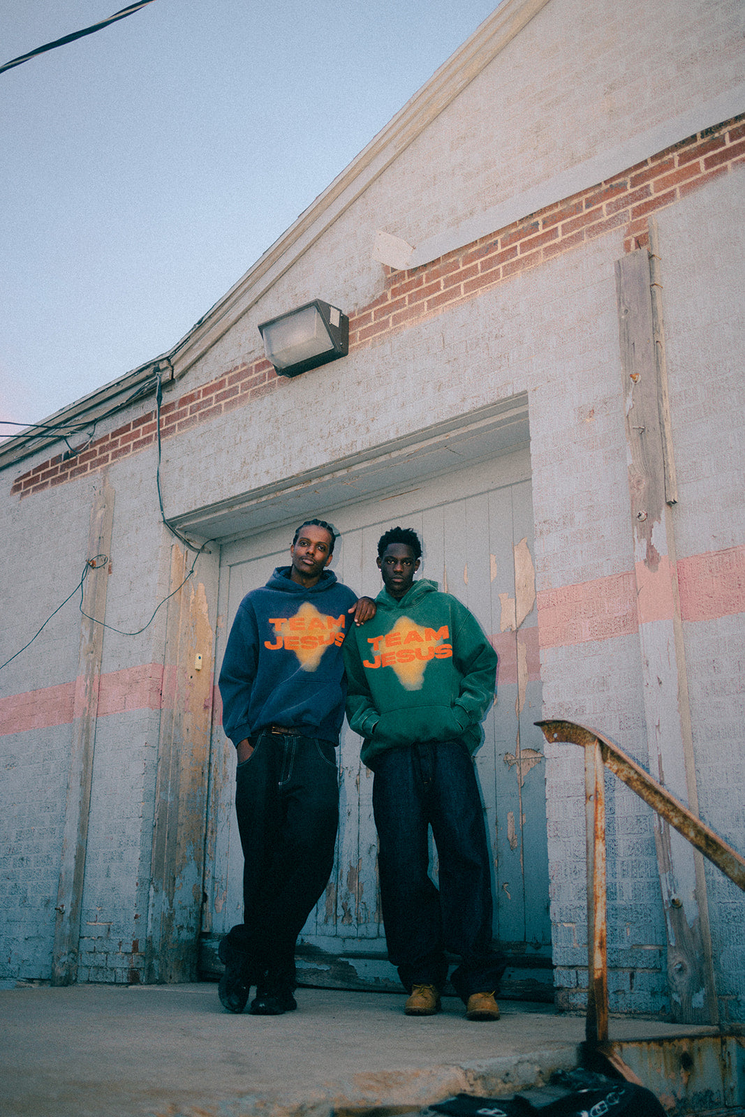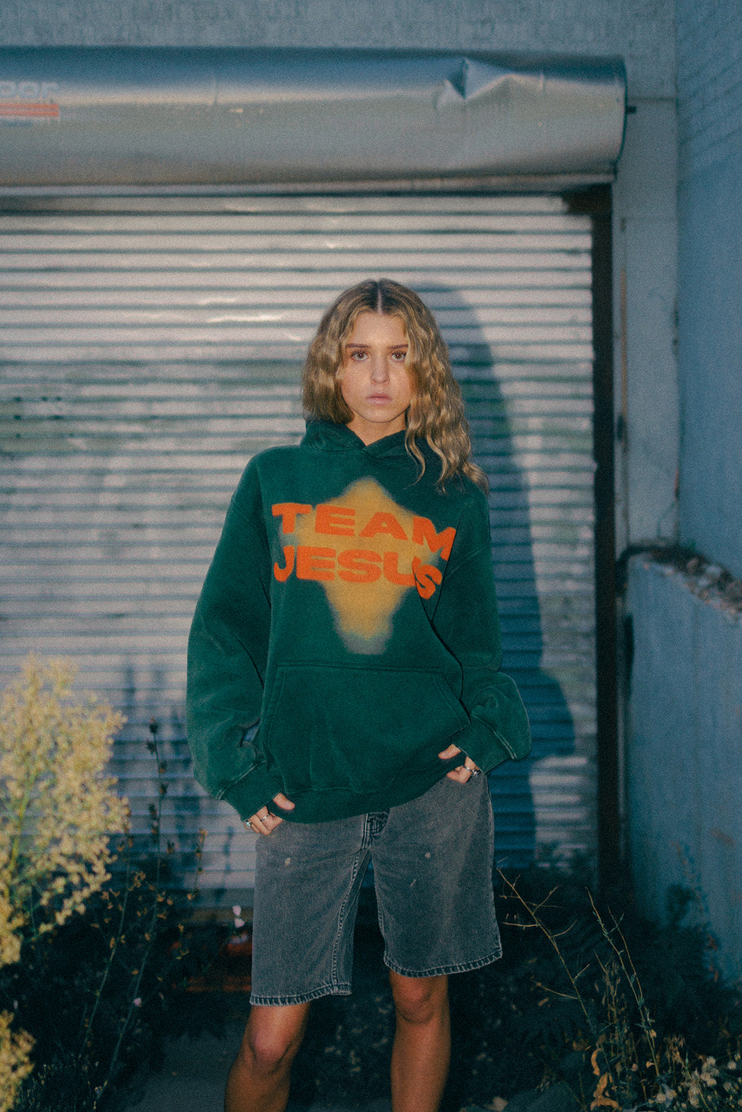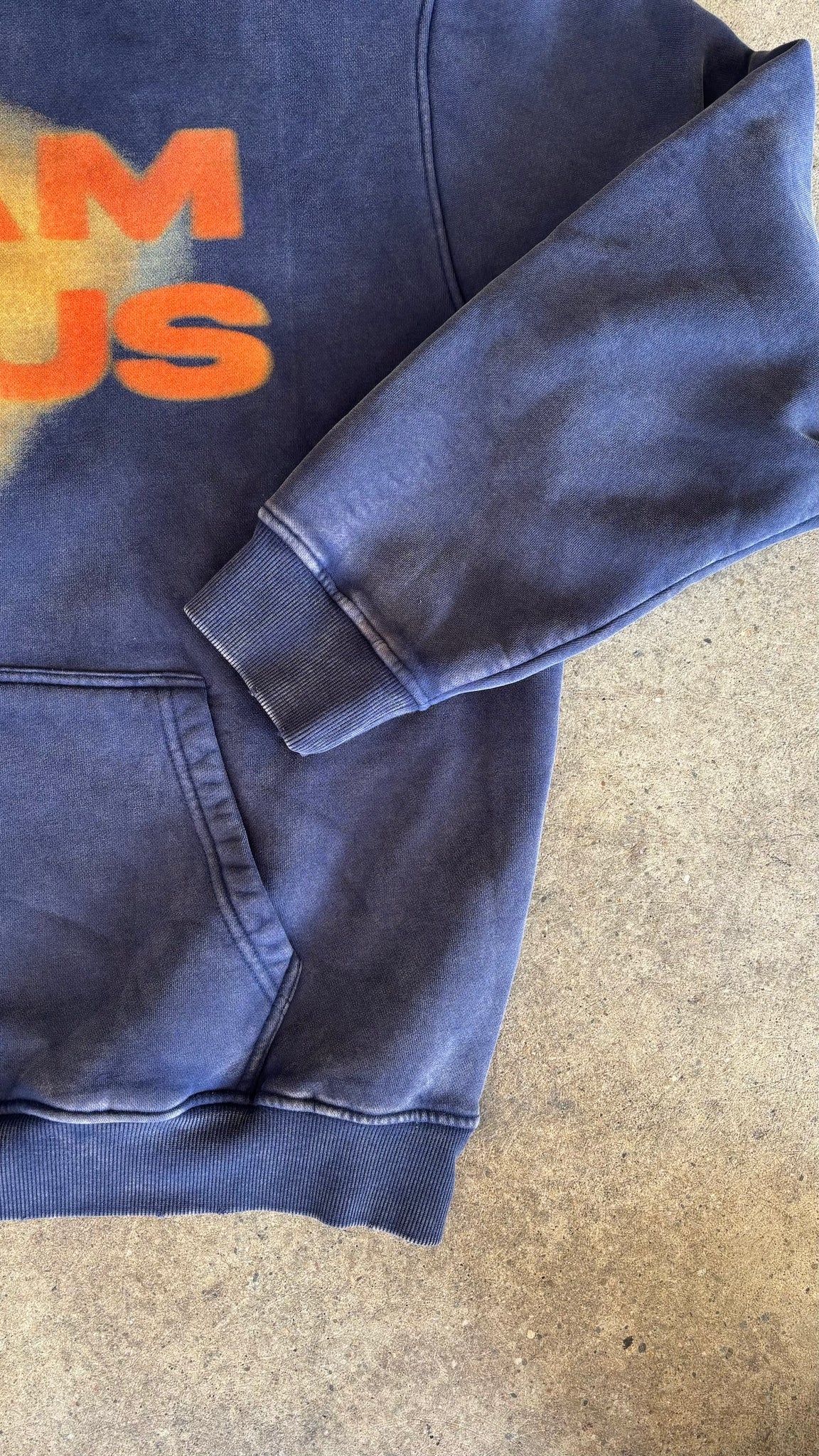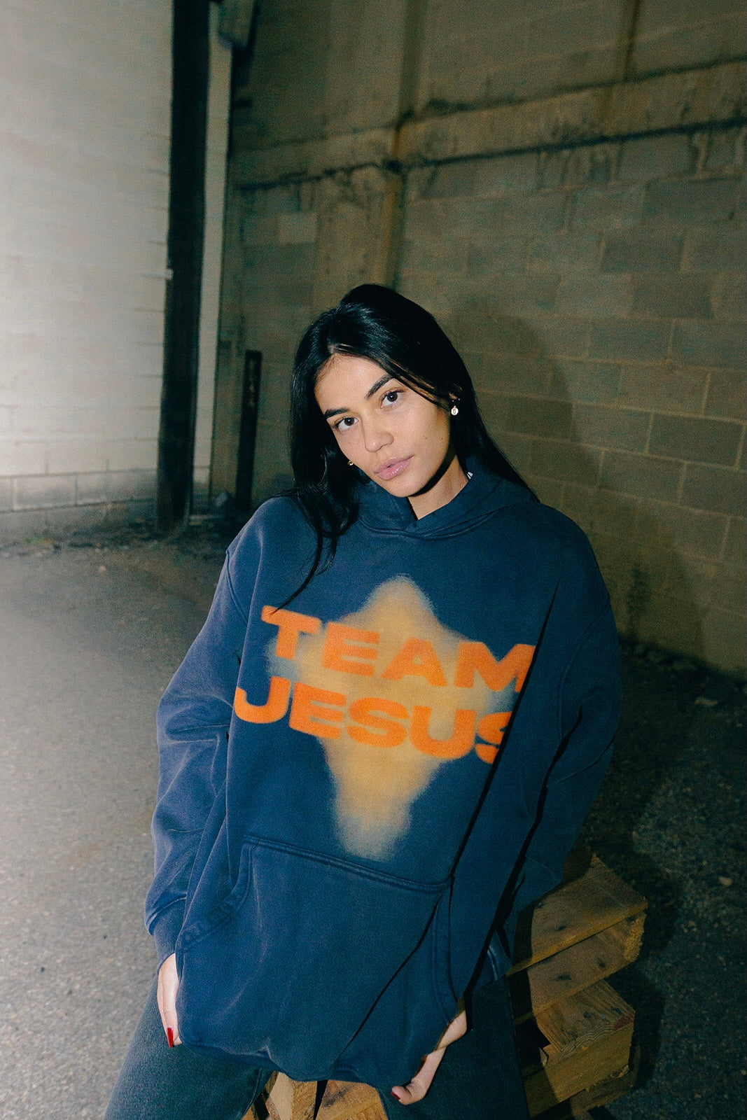 Gradient washed hoodie with figure of light and "Team Jesus" printing.
